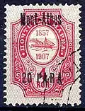 In 1909, a 50th-anniversary commemorative issue was produced by substituting the ROPiT sailing ship logo in the place of the imperial eagle. 1909 also saw the issuance of these stamps overprinted in French with the names of cities where the Russian post offices were located: "Beyrouth" - Beirut, "Constantinople" - Constantinople, "Dardanelles" - Dardanelles, "Jaffa" - Jaffa, "Jerusalem" - Jerusalem, "Kerassunde" - Giresun,"Mersine", "Mételin" - Mytilene, "Mont Athos" - Mount Athos, "Rizeh" - Rize, "Salonique" - Salonica, "Smyrne" - Smyrna, "Trebizonde" - Trabzon.