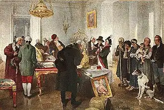 Edicts of 1718, 1734, 1750, 1761, and 1767 obliged landlords to feed their peasants in times of crop failure and famine and to prevent their impoverishment. Since 1722 landlords were responsible for the correct payment of the per capita tax by their peasants (the tax was collected from the peasants and paid to the treasury by the landlord himself or his clerk). It was forbidden to put peasants on torture for their master's debts. In order to suppress fraudulent practices of landlords, who during audits recorded persons who did not belong to serfs, allegedly with their consent, decrees of 1775, 1781 and 1783 prohibited voluntary registration of serfs. The legislation stipulated conditions that allowed peasants to leave the serf state. Edicts of 1737, 1743, 1744, 1745, 1770, and 1773 declared free those who returned from captivity, as well as foreigners who accepted Eastern Orthodoxy. The children of foster homes and those who had graduated from the St. Petersburg Academy of Arts could not be enserfed. Freedom was granted to retired soldiers who were serfs.[15] Peter III created two measures in 1762 that influenced the abolition of serfdom. He ended mandatory military service for nobles with the abolition of compulsory noble state service. This provided a rationale to end serfdom. Second, was the secularization of the church estates, which transferred its peasants and land to state jurisdiction.[16][17] In 1775 measures were taken by Catherine II to prosecute estate owners for the cruel treatment of serfs. These measures were strengthened in 1817 and the late 1820s.[18] There were even laws that required estate owners to help serfs in time of famine, which included grain to be kept in reserve. These policies failed to aid famines in the early nineteenth century due to estate owner negligence.[19]