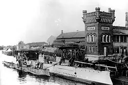 The first commanding officer of Minoga was Lieutenant A. V. Brovtsyn before he was replaced in 1912 by Lieutenant A. N. Garsoyev. The boat did not carry out many training exercises and its crew relied on their earlier experience on other submarines. Its early service was largely uneventful, with the exception of one major incident.[6][7] The submarine sank during a test dive near Libau on 6 April 1913 because a crewman left a signal flag that ended up blocking one ventilation shafts and prevented it from closing during the dive, causing a flood.[8] The crew, unable to use the ballast tanks to return to the surface, sent out an emergency buoy to the surface and also contacted their home base. A crane and other equipment was brought, successfully lifting Minoga from its location underwater and releasing the crew.[6][7] In total they had been in the submarine for twelve hours and there were no deaths, although they were sick from chlorine that was produced by water making contact with the electric battery and from the cold.[6][8]