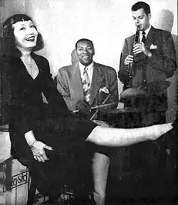 In the course of over 20 years, Ruth had the opportunity to learn much about the nightclub business. It is reported that she knew all of the members of the Count Basie, Duke Ellington, Benny Goodman and Jimmie Lunceford bands.[25] She also worked as a gossip columnist for Down Beat jazz magazine under Ned Williams, for The Boston Record under George MacKinnon (1938), for Swing magazine under Barry Ulanov and for The Boston Post.[25][47][note 6] She was a publicist for the Count Basie Orchestra in the late ‘30s.[48] She worked with George Avakian and Jack Jenny when he recorded "Stardust" with his band.[25] She did publicity for about 90% of all swing bands of the 1930s, including Count Basie, Woody Herman, Mary Lou Williams, Bobby Hackett and others.[25]