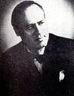 Some of the country's first major stars were singer Ichiro Fujiyama and composer Masao Koga. Koga attempted to initiate fusion of Western jazz and Japanese dodoitsu.[16] Fujiyama's 1931 song "Sake wa Namida ka Tameiki ka" (酒は涙か溜息か, lit. "Is Sake Tears or Sighs?"), composed by Koga, became a major hit in Japan. This song created a fusion of Fujiyama's crooning and Koga's guitar play.[16] Using the vocal technic Mezza Voce with a microphone, Fujiyama sang the song by the deep voice of not Opera's G minor but D minor.[16] Fujiyama's song "Oka o Koete" (丘を越えて, lit. "Beyond the Hill") sold 600,000 copies.[17] However, Fujiyama was an elite student, who specialized Western classical music in the Tokyo Music School. Ryūkōka songs often dealt with the "Ero Guro Nansensu" things.[18] Since his school regarded ryūkōka as bad form at that time, Fujiyama was once suspended from the school, though Fujiyama was not dismissed from the school because Klaus Pringsheim Sr., a professor of the school, opposed the proposal of Fujiyama's expulsion.[16]
