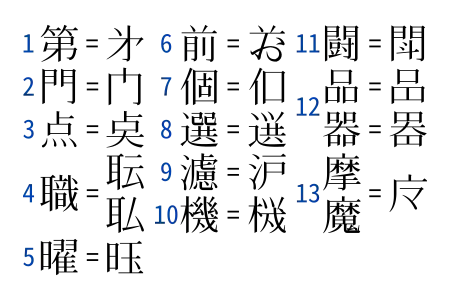 - 1 and 2. (第, 門 – These are perhaps the most commonly used Ryakuji. 1 (dai, ordinal prefix) is present in Unicode as U+3427 (㐧), but is not supported by the MS Gothic or Mincho family of typefaces, or Arial Unicode MS. According to the original Japanese article, 1 has been seen on roadsigns on the Keihin #3 Road (㐧三京浜道路, Dai-San Keihin Dōro). 2 is present in Unicode as U+95E8; it is unified with the closely related Simplified Chinese abbreviation 门 (both originated from cursive script forms). The Japanese form may be explicitly induced with the sequence U+95E8 U+E0100.