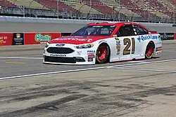 Blaney began competing full-time in the Cup Series in 2016 with the Wood Brothers despite the team being excluded from NASCAR's new Charter system implemented before the 2016 Cup Series season.[26] He got his third top-ten of his career at Las Vegas, finishing sixth. Before the race at Auto Club Speedway, Blaney and close friend Bubba Wallace drove together from Phoenix to Fontana and stole the headlines one evening when they took over NASCAR's Snapchat account and filmed themselves mimicking drivers such as Carl Edwards, Danica Patrick, and Paul Menard.[27] Blaney picked up more top tens at Phoenix, Talladega, Dover, and Pocono for a successful first half of the season with his best finish being a fifth at Kansas. At Chicagoland, Blaney ran well all day and for the final restart, he gambled and stayed out, and got the race lead. However, on the restart Martin Truex Jr. overtook him easily due to having fresher tires and held on to get the win, with Blaney finishing fourth. He put up a fight for the Sunoco Rookie of the Year award, but lost to Chase Elliott.[28]
