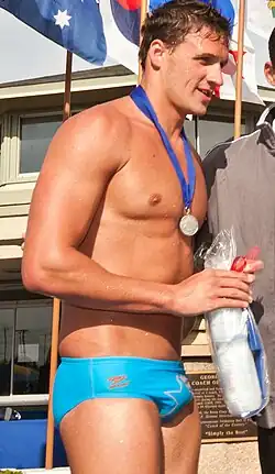 Lochte qualified for his first Olympics after finishing second to Michael Phelps in the 200-meter individual medley at the 2004 U.S. Olympic Team Trials.[25] He also qualified for the 4×200-meter freestyle relay team after finishing fourth in the 200-meter freestyle final.[26] At the 2004 Summer Olympics in Athens, Greece, Lochte swam with Phelps, Klete Keller, and Peter Vanderkaay to upset the Australian team and capture the gold medal in the 4×200-meter freestyle relay. It was the first loss for the Australian team in six years.[27][28] He also narrowly edged out George Bovell and László Cseh in the 200-meter individual medley to win the silver medal behind Phelps.[29][30]