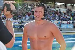 At the 2009 National Championships, the selection meet for the 2009 World Aquatics Championships, Lochte won individual titles in the 200 and 400-meter individual medley.[57][58] Lochte also qualified to swim in the 4×100 and 4×200-meter freestyle relay.[59][60] In the 200-meter backstroke final, Lochte placed second behind Aaron Peirsol, and lost his world record he set in Beijing when Peirsol recorded a time of 1:53.08.[61]