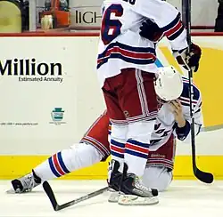 McDonagh continued his strong play and leadership into the 2015–16 season, his second as team captain. However, during a February 6, 2016, game against the Philadelphia Flyers, McDonagh suffered a concussion after getting punched by Flyers' forward Wayne Simmonds after McDonagh cross-checked Simmonds.[22] McDonagh missed eight games as a result, including a February 14 rematch between the two teams, during which Rangers' rookie defenseman Dylan McIlrath fought Simmonds.[23] Still feeling the effects of the concussion, McDonagh was scratched for two games of the Rangers first round playoff series against the Pittsburgh Penguins, which the Rangers ultimately lost in five games as the Penguins eventually went on to win the Stanley Cup.