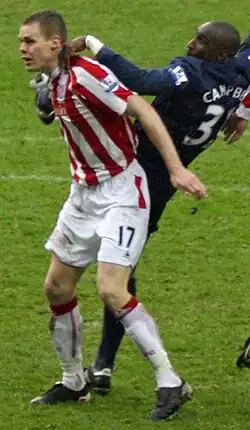 After starting in Stoke's first match in the Premier League in a 3–1 defeat away at Bolton Wanderers Shawcross lost his place in the team to new signing Ibrahima Sonko and he stated that he might have to leave Stoke if the manager signed another defender.[23] Shawcross re-claimed his place in team in late 2008 due to Sonko's poor performances.[24] In a match against Arsenal in November 2008, a Shawcross off-the-pitch tackle led to a three-week injury to Emmanuel Adebayor.[25] Following his return to the team, Shawcross scored in matches against Aston Villa,[26] Everton,[27] and Middlesbrough.[28] The goal against Boro proved to be vital win for Stoke in the fight from relegation.[29] After a fine debut Premier League season, Shawcross was linked to several clubs Premier League rivals however both Shawcross and Stoke manager Tony Pulis dismissed this speculation.[30][31]