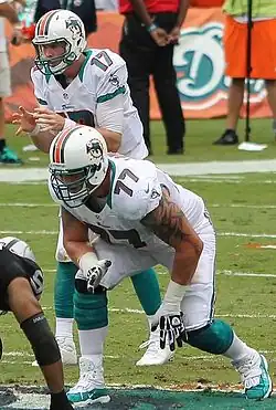 In the 2012 NFL draft, the Miami Dolphins selected Tannehill in the first round with the eighth overall pick.[28] He was the first quarterback selected by the Dolphins in the first round since Dan Marino went 27th overall in 1983. He became the 17th starting quarterback by the Dolphins since Marino and only the third quarterback taken in the first round in franchise history after Hall of Famers Bob Griese and Marino.[29]
