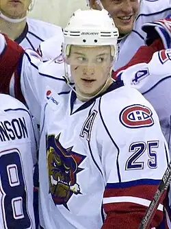 White made his NHL debut in a call-up to the Montreal Canadiens on November 5, 2009 against the Boston Bruins, recording an assist.[1] He was called up once again for a game against the Ottawa Senators the following month on December 8. After playing in the first period of that game, he was pulled from the game after the NHL noticed he was playing, despite the Canadiens not having properly reported his call-up to the league before the 5 p.m. deadline.[2]
