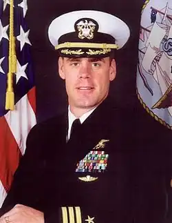 Zinke served as a U.S. Navy SEAL from 1986 to 2008, retiring at the rank of commander.[26] He graduated from Basic Underwater Demolition/SEAL training (BUD/S) class 136 in February 1986[3] and subsequently served with SEAL Team ONE. Following SEAL Tactical Training and completion of a six-month probationary period, he received the 1130 designator as a Naval Special Warfare Officer, entitled to wear the Special Warfare insignia also known as "SEAL Trident". Zinke was assigned as a First Phase Officer of BUD/S from 1988 to 1991. In 1991, he received orders to United States Naval Special Warfare Development Group (NSWDG) and completed a specialized selection and training course. Zinke served at the command until 1993, during which time he planned, rehearsed, and took part in carrying out classified operations.[21][27] He then served as a Plans officer for Commander in Chief, U.S. Naval Forces, Europe and served a second tour with NSWDG as team leader, ground force commander, task force commander and current operations officer from 1996 to 1999.[21]