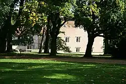 It was long believed that Rycote House burned down in 1745 and that its remains were demolished in 1800, apart from one corner turret and some outbuildings.[2] However, in 2001 Channel 4's Time Team investigated Rycote Park looking for the remains of the Tudor Rycote House and established that Rycote had been rebuilt after the fire over a period of about 20 years.[8][12] The Bodleian Library in Oxford holds records of sales of contents and fabric from Rycote, indicating that the Tudor house was sold by lot for removal between 1779 and 1807, the year in which the 5th Earl of Abingdon ordered its demolition.[13] In about 1920 the extensive stables were converted into the present Rycote House.[10] Later Rycote belonged to the Member of Parliament and prominent Rugby Union player Alfred St. George Hamersley (1848–1929). In the chapel there is a memorial to Hamersley made by the sculptor Eric Gill.[2] The house is Grade II* listed.[14]