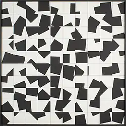 Winiarski experimented with chance and probability by composing abstract arrangements of small squares, initially in black-and-white and later in color.[3] Winiarski regarded the anonymous building blocks of a small square as "statistical material" from which to build the surface of the work.[4] In 1966, Winiarski wrote: "My ambition involves attempts at visually recording events and presenting their statistical distributions visually. The multitude of possibilities that such treatment of the image offers fascinates me".[2]: 404–405 Between 1967 and 1977, Winiarski created set designs for several plays performed in Poland, including Medea by Euripides, William Shakespeare's Othello and Macbeth, among others.[1]