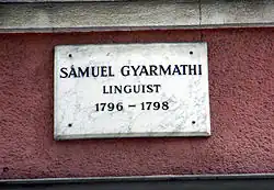 Sámuel Gyarmathi (Hungarian: Gyarmathi Sámuel) (July 15, 1751, Kolozsvár — March 4, 1830, Kolozsvár) was a Hungarian linguist, born in Cluj (then Kolozsvár, Transylvania). He is best known for his systematic demonstration of the comparative history of the Finno-Ugric languages in the book Affinitas linguae hungaricae cum linguis fennicae originis grammatice demonstrata (1799), which rested on the earlier work of János Sajnovics.[1]