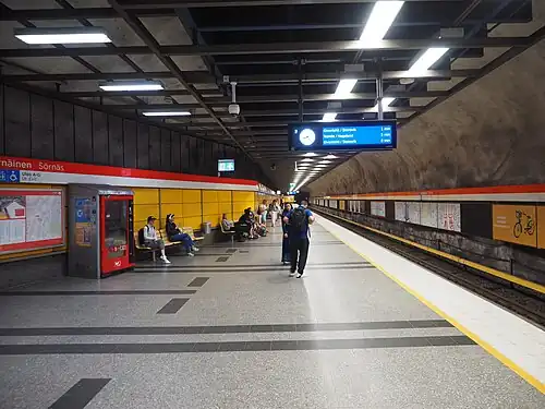 Sörnäinen metro station (Finnish: Sörnäisten metroasema, Swedish: Sörnäs metrostation) is a station on the Helsinki Metro.[2] It serves the central Helsinki districts of Sörnäinen and Kallio. Sörnäinen is the easternmost station on the system to be located underground.