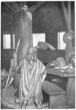 The nature of Cúchulainn's parentage is unclear and inconsistent. In one version, Deichtine fosters the baby son of Lugh, but he becomes sick and dies. Then she is made pregnant by Lugh, who tells her to name the child Sétanta, but as she is betrothed to Súaltam, she aborts the pregnancy, marries Súaltam and has his child, whom she names Sétanta. The child is later renamed Cúchulainn.[1] In another version, Deichtine disappears from Emain Macha, until the nobles of Ulster are led by a flock of magical birds to a house, where they are welcomed by Lugh. He tells them his wife is due to give birth soon, and when she does the Ulstermen discover she is Deichtine. The child is named Sétanta.[2] He is brought up by Súaltam and Deichtine in their house on Muithemne Plain in County Louth.[3]