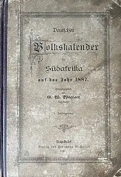 - Deutscher Volkskalender für Südafrika auf das Jahr 1887. Authored by G.W Wagener. The almanac was 287 pages long and contained entries and advertisements as well as some half tone illustrations and a portrait of Kaiser Wilhelm I.[6] It also contained a list of names of Germans living in Cape Town in 1886.[7] A Full text version of the Almanac is available from Internet Archive[8]