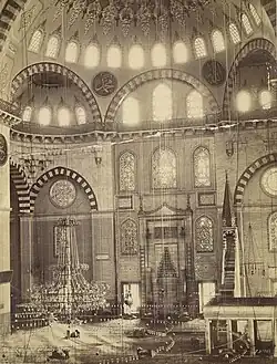 Most or all of the mosque's original painted decoration has been destroyed in the course of later damages and repairs.[20] Very little is known directly about the original painted decoration.[50] The present-day painting of the central dome dates from a 19th-century restoration by the Fossati brothers, who chose to roughly imitate Ottoman Baroque decoration. Traces of the original decoration were found during 20th-century cleaning and suggest that blue colours were used before Sinan replaced them with predominantly red colours. The Fossati-era painting has been maintained in more recent restorations as it is now considered part of the mosque's history.[20] Elsewhere, the voussoirs of the mosque's stone arches are painted in red and white to imitate marble.[51] Except for the inscriptions carved in stone, most of the other calligraphy found throughout the mosque is painted and was thus likely restored in later periods. The restorations appear to have been careful and probably retain some aspects of the original compositions.[20]