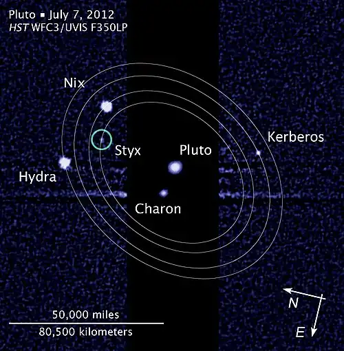 Styx, formal designation (134340) Pluto V, is a small natural satellite of Pluto whose discovery was announced on 11 July 2012. It was discovered by use of the Hubble Space Telescope, and is the smallest of the five known moons of Pluto. It was imaged along with Pluto and Pluto's other moons by the New Horizons spacecraft in July 2015, albeit poorly with only a single image of Styx obtained.[5]