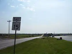 The eastern SH-15 picks up a US-64/412 south of Garber, and begins concurrent with State Highway 74 heading northbound. It splits from SH-74 to head through Billings and has an interchange with Interstate 35 at milemarker 203. It then has a five-mile (8.0 km)[3] concurrency with U.S. Highway 77. After leaving US-77, it passes through Red Rock, and has a 4 miles (6.4 km)[3] concurrency with US-177, and splits off just north of the intersection with the Cimarron Turnpike. It bridges Sooner Lake and runs for 15 more miles (24 more km) before ending at State Highway 18 north of Pawnee.