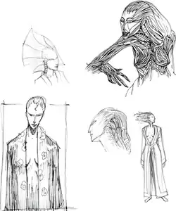 For System Shock 2, Ryan Lesser was commissioned by Mammoth Studios to develop the box art for the title, consisting of a silver female face with green eyes and lips, and various wires and cables extending from it. The model he produced for it was later used in game, with Lesser creating the lip sync animations for it.[3] While the development team originally did not want to use it for the box art due to it giving away SHODAN's presence in the game, all other pieces of artwork provided by publisher Electronic Arts had proven insufficient, and they felt they had spent a significant amount to have it made as is.[15] Lead artist Gareth Hinds meanwhile conceived the design of her cyberspace appearance, resembling a pale woman with wires embedded in her skin wearing a patterned robe, while wires making up her hair splay outward to form a headdress.[4]