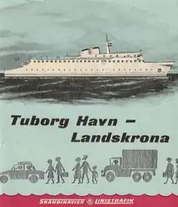 Skandinavisk Linjetrafik (SL) was a shipping line that operated car ferries in the central part of Øresund, between Port of Tuborg, Copenhagen, Denmark and Landskrona, Sweden. The shipping line sailed this route between 1951 and 1980.[1] During the first ten years of operation, the SL ferries was a Danish-owned shipping line, but in 1961 SL was bought by Stockholms Rederi AB Svea.[1] The new owners also owned the LB (car ferries), which since 1955 operated at the Helsingør–Helsingborg ferry route with ports north of the Copenhagen–Landskrona route, the first challenger of the de facto–monopoly at that route which DSB had enjoyed since 1882.