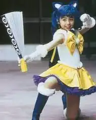In Act 27 of the live-action series, Luna gains the ability to turn into a young human girl, given the name Luna Tsukino (月野 ルナ, Tsukino Runa), and is able to transform into Sailor Luna (セーラールナ, Sērā Runa), the "Guardian of Love and Small Things."[2] Her uniform is colored in yellow and purple, along with purple boots with white fur atop of them as well as in the sleeves, a jingle bell instead of a brooch, and a cat ear motif in her dark blue hair. Luna's personality as a human girl is essentially identical to her normal self, except that she has a mild obsession with sweet foods and behaves more like a real cat, in that she runs from dogs and is easily distracted by toys. She also has heightened hearing and is able to move extremely quickly. Luna involuntarily transforms back into a plushie under certain circumstances such as sneezing, taking a direct attack from an enemy, or falling unconscious.