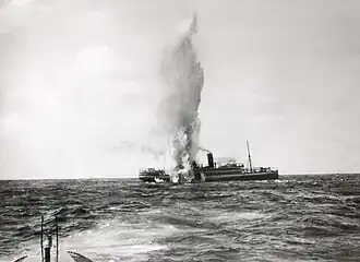 An alternative description of the event states that when the ammunition detonated, a truck carried as deck cargo was blown into the air and fell from a great height on the U-boat, sinking it.[9]