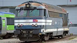 With the opening of the LGV Sud-Est, thirty BB 67000 class locomotives were fitted with cab signalling and radio to operate ballast trains and for use in an emergency on the high speed lines. For the latter purpose they were fitted with a Scharfenberg coupler at one end to enable them to be attached to a TGV rake. Initially the class was based at Nevers.[1] A further 50 locomotives were subsequently converted.