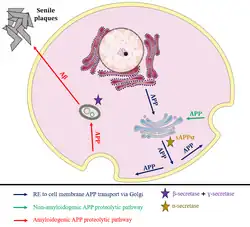 The amyloid precursor protein (APP) is consecutively transported from the ER after its synthesis to the plasma membrane via the trans-Golgi network; during this traffic, the neuroprotective soluble fragment sAPPα is produced as a product of APP cleavage by α-secretases. Lately, APP that reaches the membrane without being severed can be internalized into endosomes in order to be proteolytically processed through two parallel pathways: an amyloidogenic pathway via acidified late endosomes and a non-amyloidogenic or anti-myloidogenic retrograde pathway via Golgi apparatus. The amyloidogenic pathway leads to APP processing by γ-secretases and β-secretases such as BACE1, resulting in production of the neurotoxic amyloid beta (Aβ) peptide that accumulates in extracellular locations forming senile plaques.[12]