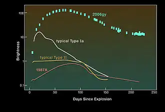 - ^ Smith, N.; Chornock, R.; Silverman, J. M.; Filippenko, A. V.; Foley, R. J. (2010). "Spectral Evolution of the Extraordinary Type IIn Supernova 2006gy". The Astrophysical Journal. 709 (2): 856–883. arXiv:0906.2200. Bibcode:2010ApJ...709..856S. doi:10.1088/0004-637X/709/2/856. S2CID 16959330.