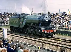 In 1925, Southern Railway president Fairfax Harrison traveled to the United Kingdom, where he admired the country's London and North Eastern Railway's apple green passenger steam locomotives.[12][13] Harrison's trip had inspired the appearance of the second order of Ps-4s built in the summer of 1926 by ALCO's Richmond Works by having them painted in Virginian green with gold leaf trimming and lettering.[12][13] This would include the original first batches and the new Crescent Limited passenger train.[12][13] The second order consisted of twelve locomotives numbered 1393-1404 for SOU, seven numbered 6476-6482 for the CNO&TP, and four numbered 6688-6691 for the AGS.[10] Aside from the paint scheme, which would soon be applied to all of Southern's passenger locomotives, the second order had other notable differences.[10] They featured an Elesco feedwater heater mounted on top of the smokebox between the stack and bell instead of under the running boards.[10] In comparison with the two-axle bogie, 10,000 US gallons (38,000 L) standard USRA tender design used on the first order, the 1926 Ps-4s were equipped with a larger three-axle bogie tender with a water capacity of 14,000 US gallons (53,000 L) designed for long-distance passenger runs and eliminating multiple water stops.[7] These locomotives were affectionally nicknamed the Harrison Engines.[14] Because of the Harrison Engines' Virginian green and gold paint scheme, they were signified as the First Ladies of the Pacifics around the SOU system.[15][16]