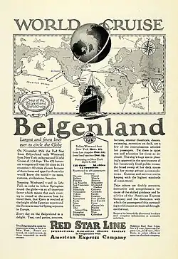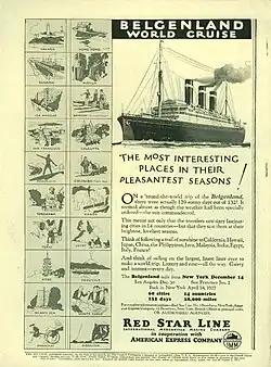 Belgenland started from New York on 4 December 1924 carrying either 350 or 384 passengers (reports differ).[33] She visited Havana, where she loaded $80,000 worth of liquor, including 23,000 bottles of beer.[34] She then became the largest liner to pass through the Panama Canal.[35] She called at San Pedro, and embarked another 100 passengers in San Francisco. From there she crossed the Pacific via Honolulu to Yokohama, then went via Manila, Java and Singapore to the Indian Ocean. She was then to call at Port Sudan for her passengers to travel by rail to Khartoum, and also to Wadi Halfa to see the Second Cataract of the Nile.[36][37] At the time, Red Star Line claimed that Belgenland was the largest ship to have circumnavigated the globe.