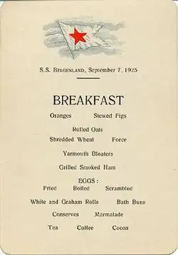 - "Belgenland-Red Star Line". Renato's World. Blogger. – menu cards from 1928–29 World cruise