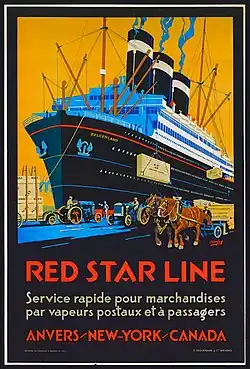 Belgenland returned to service in 1923. Her transatlantic route was now between Antwerp and New York via Southampton.[4] Cardinal Mercier, Primate of Belgium, blessed her before she made her first departure from Antwerp as an ocean liner[20] on 4 April. On her first voyage she carried only 260 passengers, including 86 in first class. She reached New York on 14 April,[15] and left on 18 April on her return voyage to Antwerp.[21] On 11 July she left New York for Antwerp carrying 290 passengers in first class.[22] On 10 November 1923 she reached Ellis Island carrying 1,257 European migrants to the U.S., including 278 from the USSR.[23]