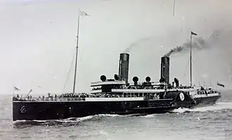 The paddle wheels were constructed of steel on the feathering principle with curved floats.[6] Steam was supplied to the engines from four double-ended boilers, producing a boiler steam pressure of 140 pounds per square inch (970 kPa) arranged in two compartments, one forward and one aft of the engine room. The boilers were of the multitubular return marine type, each having eight corrugated furnaces being constructed entirely of steel to Board of Trade requirements and working on a system of forced draught with fans fitted to supply air. Sixteen firemen worked at her 32 furnaces.[6]