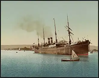 In 1900 Golconda was chartered as a troopship during the Boer War, sailing from London to Malta on 3 January 1900 with nearly 1000 troops of the Royal West Kent Regiment.[8] Taken up again, in August 1902 she brought 500 Boer prisoners to Durban from Calcutta, and then carried 900 returning troops to Southampton.[9][10] This was followed by 1000 Boer prisoners from St Helena to Simonstown and troops from Durban to Ceylon.[11] [12] Returning to her regular London-Calcutta service, Golconda was gradually outclassed by more modern vessels in the B.I. fleet and was transferred to the company's East African service.[1]