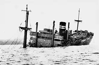 However, River Burnett slowly sank by her bow, and after about four and a half hours her bow struck the seabed about a mile off Point Davy, between Frankston and Mornington.[22] Her bow lay in water about 50 feet (15 m) deep, and she was also listing ten degrees to port. Her port boiler was submerged, but her starboard boiler remained above water and continued to provide steam for her pumps and electric lighting.[20][23] The tug Howard Smith rescued 36 members of her crew. 10 men stayed aboard River Burnett to work her pumps and starboard boiler try to keep her stern afloat.[22]