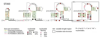 The Ssbp, Topoisomerase, Antirestriction, XerDC Integrase RNA motif (STAXI RNA motif) is a conserved RNA-like structure identified using bioinformatics.[1] STAXI RNAs are located near to genes encoding proteins that interact with DNA (Ssbp, topoisomerase, XerDC integrase) or are associated with such proteins (antirestriction proteins, which inhibit restriction enzymes). This observation raised the possibility that instances of the STAXI motif function as single-stranded DNA molecules, perhaps during DNA replication or DNA repair. On the other hand, STAXI motifs often contain terminal loops conforming to the stable UNCG tetraloop, but the DNA version of this tetraloop (TNCG) is not especially stable. The STAXI motif consists of a simple pseudoknot structure that is repeated two or more times (see diagram).