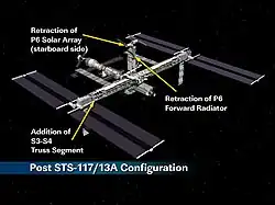 The STS-117 mission delivered the second starboard truss segment (S3/S4) and associated energy systems to the International Space Station (ISS).[2] Manufactured by the Boeing Company at the Michoud Assembly Facility, S3/S4 is the heaviest station payload the shuttle has ever carried.[8] The main functions of the S3/S4 truss segments are to provide electrical power and data interfaces for station's electronics and convert sunlight to electricity. They also provide active thermal protection to electrical components throughout the space station and allow the connection of platforms to store spare parts. S3/S4 segments were the second starboard addition to the ISS truss structure after the S1 truss was attached during Atlantis' STS-112 mission.