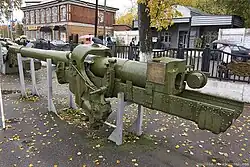 It mounted a 152 mm gun-howitzer on the chassis of a KV-1S heavy tank. Later production used an IS tank chassis and was re-designated ISU-152.[2] Because of its adopted role as an impromptu heavy tank destroyer, capable of knocking out heavy German armoured vehicles such as the Tiger and Elefant, it was nicknamed Zveroboy ("Beast Slayer").[3]
