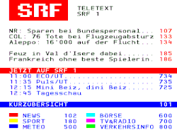 The Teletext service started operations on SF DRS in 1984, on TSR in 1985 and on TSI in 1986.[4] In 2001, the number of daily viewers reached a record of 1.17 million. In 2004, that number reached 1.3 million a day.[4]