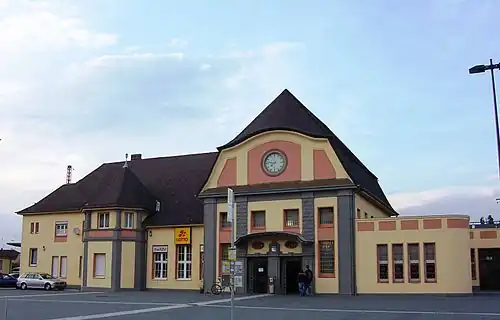 The first station on the territory of today's Saarlouis was opened in Fraulautern on 16 December 1858 during the construction of the Saar line.[5] However, Saarlouis was cut off from rail traffic, which hindered its economic development and the city fell behind the neighbouring communities of Dillingen and Bous. This initially led to the establishment of the Straßen- und Kleinbahnen im Kreis Saarlouis (Tramways and Light Railways in the District of Saarlouis). In addition, it was decided to construct a railway station in the current district of Roden.[6] Saarlouis station was opened on the present site on 19 December 1912.[7] From the mid-1960s the station was connected to the electrical network of Deutsche Bundesbahn after the station was renamed to Saarlouis Hauptbahnhof ("main station", although there are no other stations in Saarlouis). Until 2002, InterRegio services also stopped in Saarlouis; since then the station has only been served by regional services.