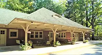 The Sacandaga Railroad Station is a historic train station located at 136 McKinley Avenue in the town of Northampton in Fulton County, New York. It was built in 1920 to serve Sacandaga Park and is a one-story, rectangular hipped roof wood-frame building, 125 feet by 30 feet, on a concrete slab foundation. It features exposed rafter ends, small louvered dormers, and broad eaves in the Shingle Style. In the 1950s it was converted for use as a stable. It is a rare surviving, non-residential building remaining from the heyday of Sacandaga Park as a resort established and served by the Fonda, Johnstown, and Gloversville Railroad.[2]