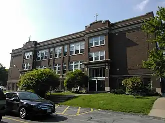 The third school building was constructed in 1914 for $104,093.44.[37] Bishop Davis dedicated the building on January 17, 1915. It was designed by Davenport architect Arthur Ebeling.[38] During the pastorate of Msgr. Mottet in the 1990s the parish school merged with St. Alphonsus School in the west end for several years and formed John Paul Academy. Both parishes then continued to sponsor their own schools until 2004 when it was no longer feasible to operate separate schools. Once again the parishes joined and with Holy Family School in central Davenport to form All Saints School. The former Holy Family School building was used by the school.[39] Parish-based religious education classes were held in the Sacred Heart School building until it was torn down in the summer of 2017.[40] A ceremony was held before the demolition.[41]