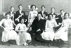 The students were taught by a staff of Franciscan Sisters from Joliet who first lived on the second floor of the original school building, then a convent wing of the school, then in a convent adjacent to the church (from 1957). It's possible Haarth turned to Franciscans because his sister had taken vows of that order.[4]