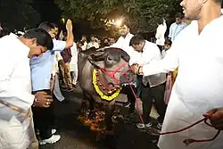 Every family takes this opportunity to showcase their best male buffalo to the rest of the community in the parade. Buffaloes are decorated by shining them with oil, painting their horns/body with bright colors, garlands around neck, anklets (gajjalu) on their feet, sea-shell bands with bells around neck or foreheads and also adorned with peacock feathers cases on their horns.[11]