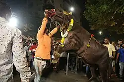 The buffaloes are decorated with garlands of flowers, painted horns, and paraded through the streets, often accompanied by the crowd dancing to the sounds of teen maar Special Yadav Band (Da Daniki).[1] The animals are sometimes encouraged to rear up on their hind legs.