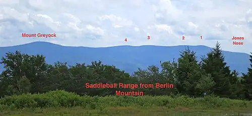 Saddle Ball Mountain and Mount Greylock are part of an 11-mile-long by 4.5-mile-wide island-like range that runs in a north-south direction bordered by the Hoosac Range to the east, the Green Mountains to the north and the Taconic Mountains to the west. During the Pleistocene, 18,000 years ago, Mount Greylock and adjacent peaks were covered by ice sheets up to 1-kilometer in thickness. As the most recent ice cap receded, the Greylock Range was an island in the midst of Lake Bascom.[6][7]