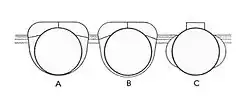 The saddle tank was formed by moving the ballast tanks outside the pressure hull.[1] Early designs raised the weather deck and casing above the pressure hull, producing a ballast tank that wrapped around the upper part of the pressure hull (diagrams A & B). Following the terminology of steam railway locomotives, this was termed a "saddle tank". Later designs, notably those of the US Fleet submarines and German U-boats, placed two separate ballast tanks lower down on the sides of the hull (diagram C). In railway practice this would have been a "pannier tank", but for submarines the "saddle" label remained.[note 1]