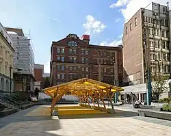 The new city square was delivered by the Co-operative Group, NOMA and Manchester City Council and was supported by the European Regional Development Fund.[4] It was designed by landscape architects Planit IE, and constructed by contractors Casey.[5]